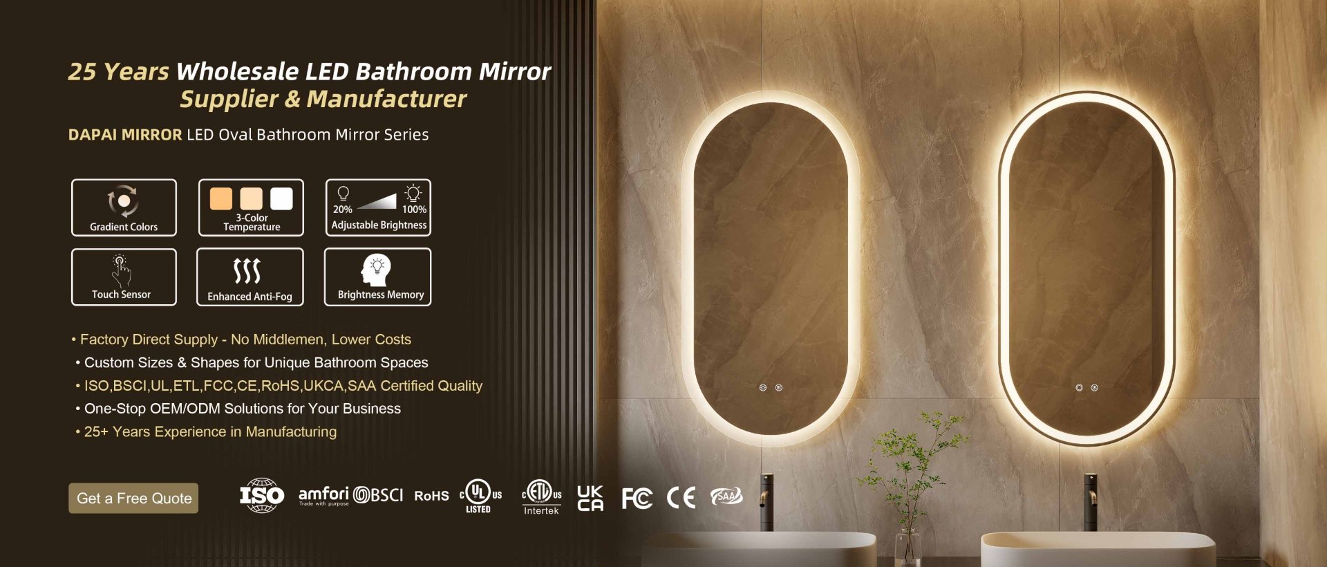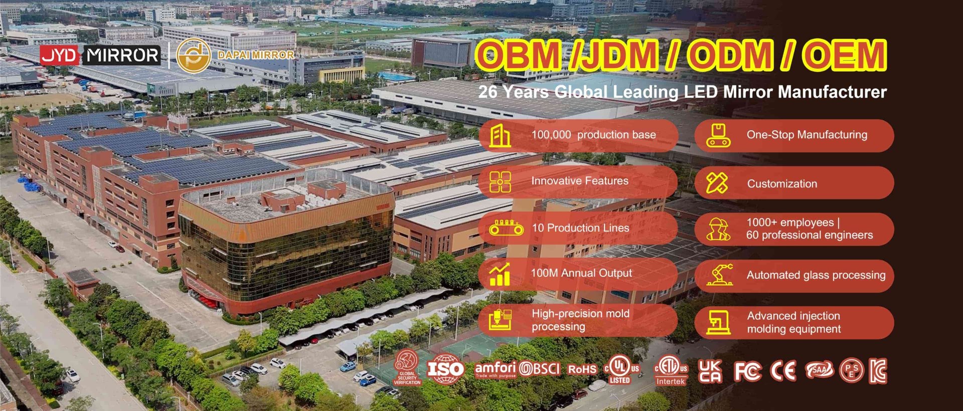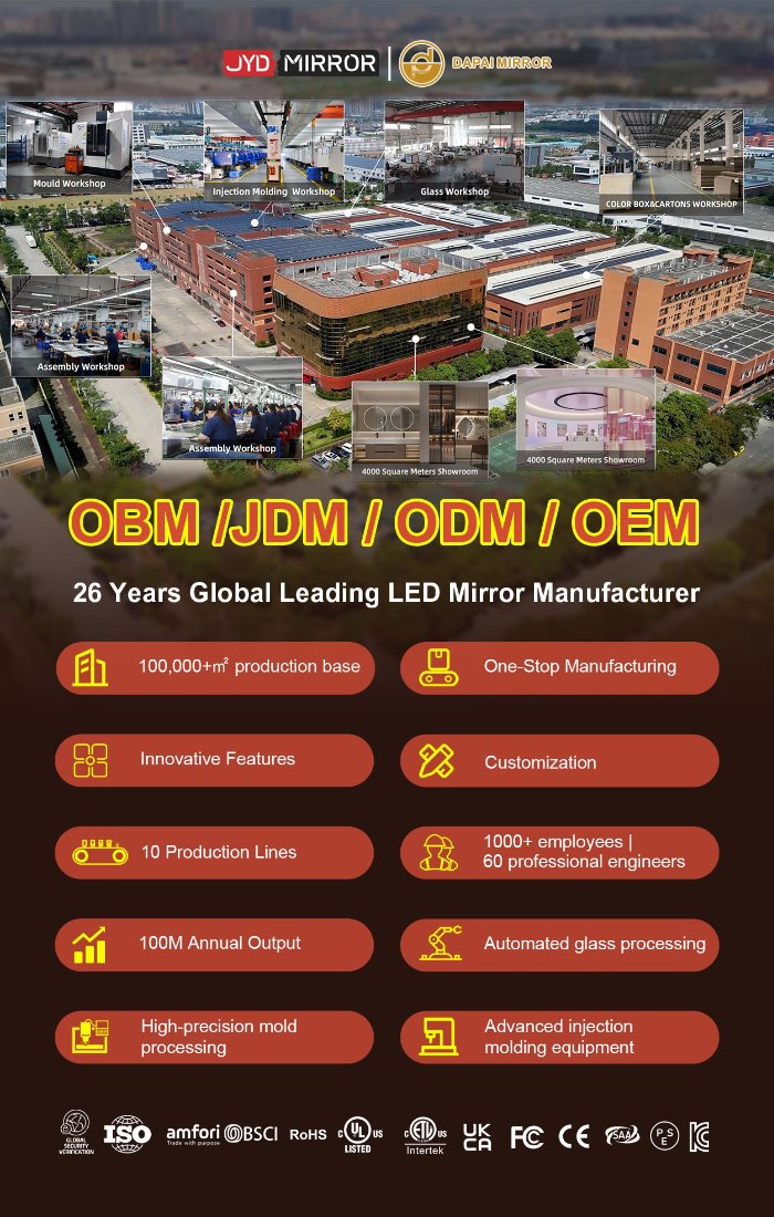 For more than 20 years, DAPAI Mirror has been a pioneer in LED mirror production, accumulating an impressive 24 years of expertise in OEM and ODM manufacturing. As one of China's premier manufacturers, suppliers, and factories, our unwavering dedication to innovation and quality has firmly established our position in the industry.